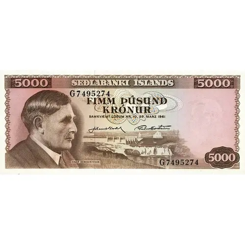 5000 SEÐLABANKI ÍSLANDS 5000 FIMM ÞÚSUND KRÓNUR SAMKVÆMT LÖGUM NR.10. 29. MARZ 1961 EINER BENEDIKTSSON 5000 (Translation: Five Thousand Kronur According to law no. 10. 29. March 1961) |