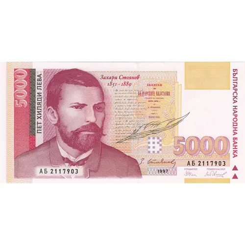 | Obverse lettering | Пет Хиляди Лева Българска Народна Банка Захари Стоянов 1851-1889 (Translation: Five Thousand Leva Bulgarian National Bank Zahari Stoyanov 1851-1889) |