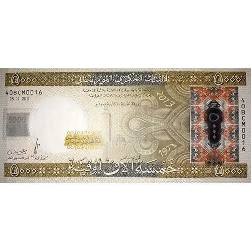 | Chữ khắc mặt trước | البنك المركزي الموريتاني 2013 1973 خمسة آلاف أوقية أوقية ٥٠٠٠ (Translation: Central Bank of Mauritania, 5000 Five Thousand Ouguiya) |