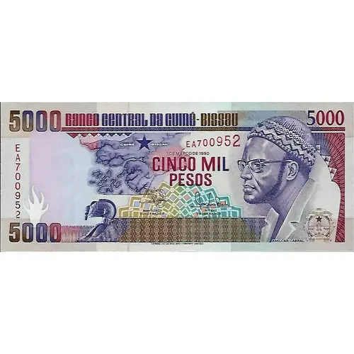 | Légende de l’avers | BANCO CENTRAL DA GUINÉ-BISSAU 1 DE MARÇO DE 1993 CINCO MIL PESOS GOVERNADOR VICE-GOVERNADOR EE397806 5000 THOMAS DE LA RUE & COMPANY LIMITED (Translation: Central Bank of Guinea-Bissau March 1st., 1993 Five Thousand Pesos) |