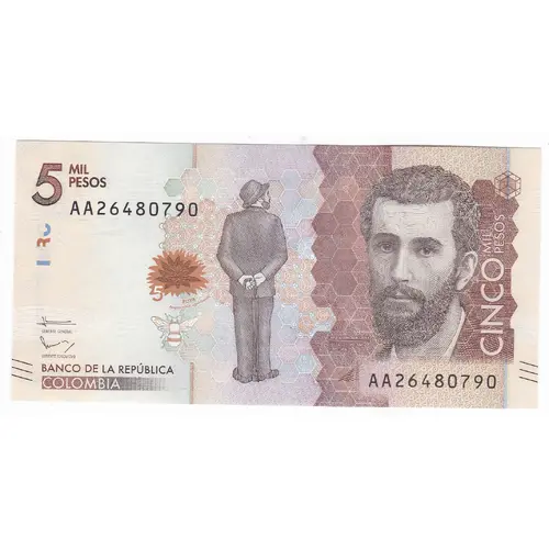 | Opschrift voorzijde | 5 MIL PESOS PUYA Paepalanthus columbiensis BANCO DE LA REPUBLICA COLOMBIA JOSE ASUNCION SILVA POETA COLOMBIANO (1865-1896) CINCO MIL PESOS (Translation: 5 thousand Pesos Puya Paepalanthus columbiensis Bank of the Republic Colombia Jose Asuncion Silva Colombian poet (1865-1896) Five thousand Pesos) |