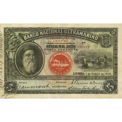 | Obverse lettering | BANCO NACIONAL ULTRAMARINO O THESOUREIRO DA FILIAL EM LOANDA PAGARÁ Á VISTA AO PORTADOR CINCO MIL REIS EM MOEDA CORRENTE VALOR RECEBIDO (Translation: National Overseas Bank, The Branch Treasurer in Luanda, Will pay the holder on sight five thousand réis in current currency) |
