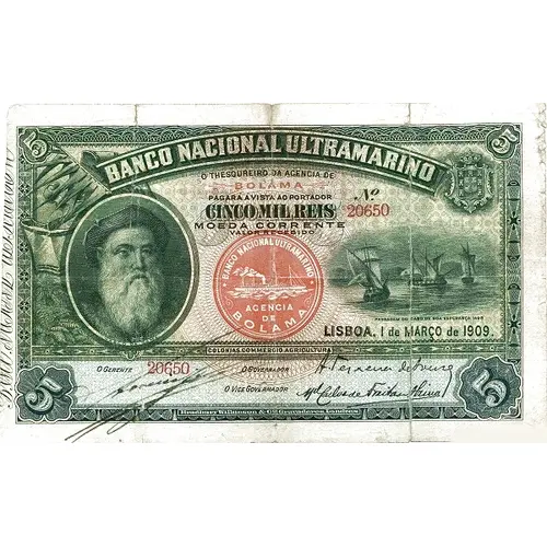 | Legenda do anverso | BANCO NACIONAL ULTRAMARINO O THESOUREIRO DA AGENCIA DE BOLAMA PAGARA A VISTA A PORTADOR CINCO MIL REIS EM MOEDA CORRENTE VALOR RECIBIDO LISBOA, I DE MARÇO DE 1909. (Translation: National Bank Overseas the Treasurer of the Agency of Bolama pay to the bearer Five Thousand Reis in currency amount received Lisbon, March 1, 1909.) |