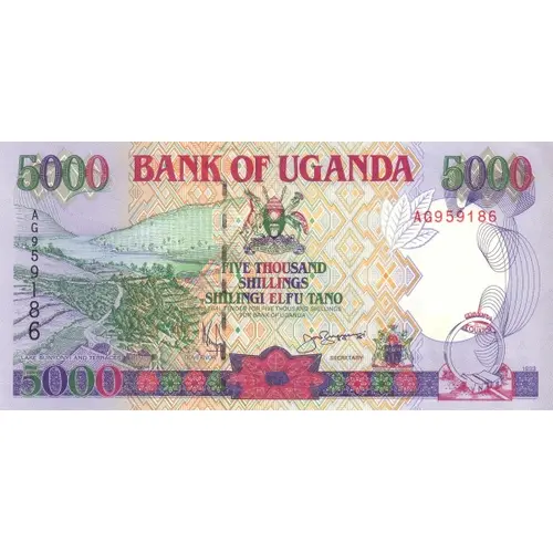 | نوشتههای روی اسکناس | BANK OF UGANDA FOR GOD AND MY COUNTRY FIVE THOUSAND SHILLINGS SHILINGI ELFU TANO LEGAL TENDER FOR FIVE THOUSAND SHILLINGS FOR BANK OF UGANDA LAKE BUNYONYI AND TERRACES 5000 (Translation: Five thousand shillings) |
