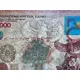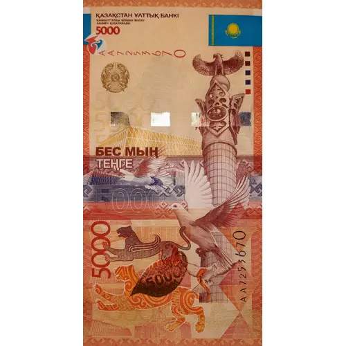 (Translation: National Bank of Kazakhstan, Five Thousand Teñge, Counterfeiting banknotes is punished by law)