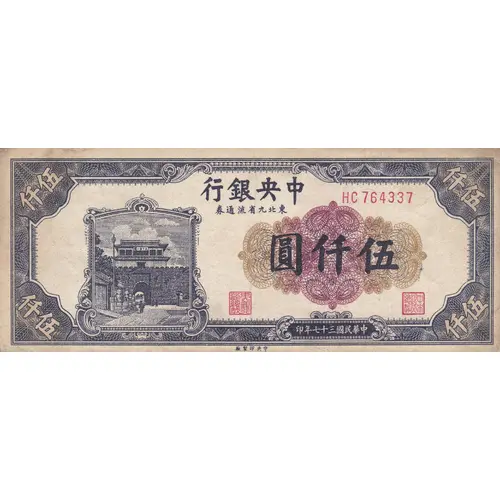 | Obverse lettering | 行銀央中 券通流省九北東 圓仟伍 印年七十三國民華中 (Translation: The Central Bank of China Circulation Notes in Northeastern 9 Provinces Five Thousand Yuan Printed in the 37th year of the Republic of China) |