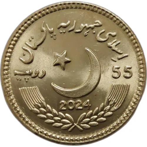 The waxing crescent moon and five-pointed star facing North West in rising position is in the center. The periphery on the top of the crescent star is inscribed in the wording `ISLAMI JAMHORIA PAKISTAN`, `اسلامہ جمہوریہ پاکستان` in Urdu script. Below the crescent and at the top of two springs of wheat with arms curved upward, there is the year of issuance 2024. The face value of the coin in numeral “55” in bold letters and `RUPIA`, `روپیہ` in Urdu script are written on the right and left sides of the crescent star respectively. |