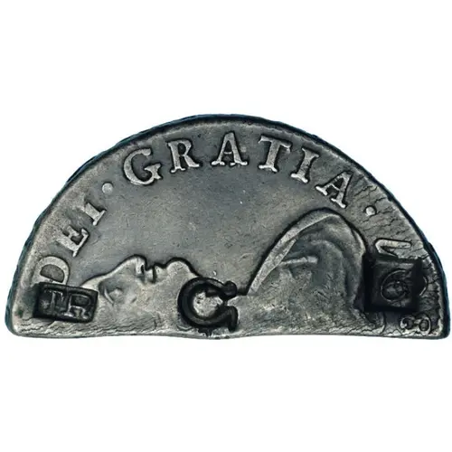| 表面の説明 | Countermark “TR”, “G”, “6” on corners and bottom of 1/2 cut of Spanish or Spanish Colonial 8 Reales, placed that way to prevent further cutting for silver scrapping. |