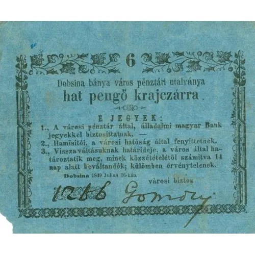 | 正面描述 | 6 Dobsina bánya város pénztári utalványa hat pengő krajczárra E JEGYEK: 1., A városi pénztár által, álladali magyar Bank jegyekkel biztosítatnak. 2., Hamisítói, a városi hatóság által fenyítettnek. 3., Visszaváltásuknak határideje a város által ha- tároztatik meg, minek közzétételétől számítva 14 nap alatt beváltandók; külömben érvénytelenek. Dobsina 1849 július 16-kán városi biztos |