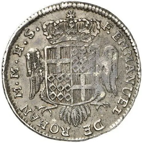| Legenda do anverso | F • EMMANUEL DE ROHAN M • M • H • S • (Translation: Fra` Emmanuel de Rohan, grand master of the Hospitallers and the Holy Sepulchre) |