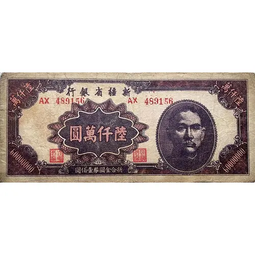 | Ön yüz lejandı | 萬仟陸 行銀省疆新 萬仟陸 圓萬仟陸 60000000 圓佰壹劵圓金合折 60000000 (Translation: 60 000 000 Sinkiang Provincial Bank 60 000 000 Sixty million yuan 60 000 000 Equivalent to 100 gold yuan 60 000 000) |