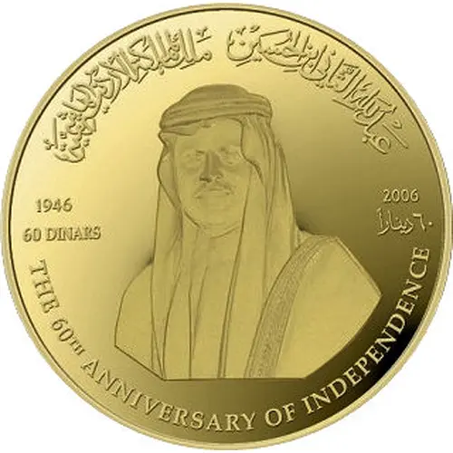 | Opschrift voorzijde | عَبدُ اللهِ الثَّاني ابنِ الحُسَينِ مَلك المملَكةِ الأردُنيةِ الهَاشِميَّة 1946 2006 60 DINARS ٦٠ ديناراً THE 60TH ANNIVERSARY OF INDEPENDENCE (Translation: Abdullah II bin Hussein, King of the Hashemite Kingdom of Jordan 1964 2006 60 Dinars The 60th Anniversary of Independence) |