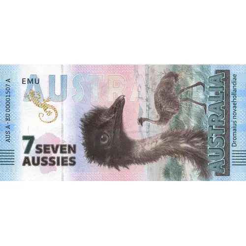 | Legenda rewersu | ULURU / AYERS ROCK 7 SEVEN AUSSIES THIS NOTE IS NOT LEGAL TENDER, BUT A UNIQUE COLLECTOR`S ITEM AND A TRIBUTE TO THE DIVERSE FAUNA OF AUSTRALIA. |