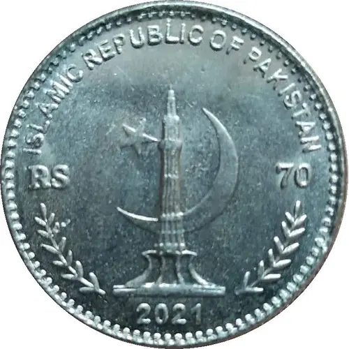In the centre on obverse of the coin there is image of `MINAR-E-PAKISTAN` with a background of waxing crescent moon and five pointed star facing north west in rising position. Along with periphery on the top of the crescent star is inscribed in the wording `ISLAMIC REPUBLIC OF PAKISTAN`. Below the image and on the bottom of two springs of wheat with arms curved upward, there is the year of issue 2021. The face value of the coin is numeral `70` in words `RS` are written on the right and left sides of the image and cresent & star respectively. |