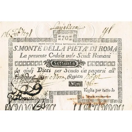 | Ön yüz lejandı | 70 PRIMO MAGGIO MILLE SETTECENTO NOVANTASETTE S. M. DI PIETA DI ROMA La presente Cedola vaglia Scudi Romani Settanta da giulj dieci per Scudo da pagarsi all` Esibitore. |