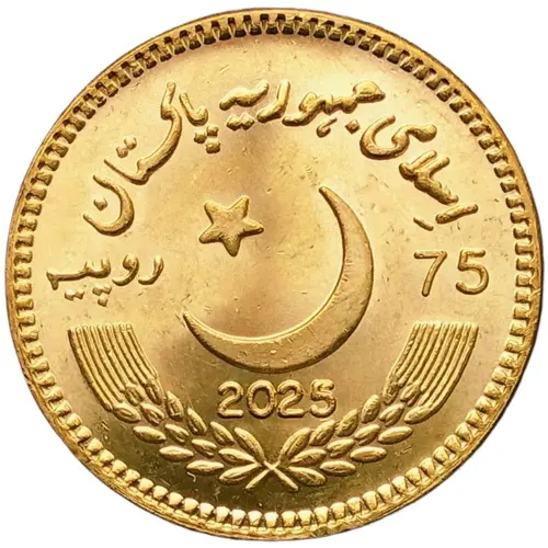 | توضیحات روی سکه | On the obverse side of the coin, the waxing crescent moon and five-pointed star facing North-West in rising position is in the center. Along with periphery on the top of the crescent star is inscribed in wording “ISLAMI JAMHURIA PAKISTAN” in Urdu script. Below the crescent and on the top of two springs of wheat with arms curved upward, there is the year of issuance 2025. The face value of coin in numeral “75” in bold letters and `RUPIA` in Urdu script are written on the right and left sides of the crescent star respectively. |