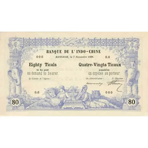 DÉCRETS DES 21 JANVIER 1875 ET DU 20 FÉVRIER 1888 BANQUE DE L`INDO-CHINE BANGKOK, le 7 Novembre 1898. Eighty Ticals to be paid on demand to bearer. Quatre-Vingts Ticaux payables en espèces au porteur. Le caissier de l`Agence : Un Administrateur : Le Directeur : 80 80 A-BRAMTOT ET G. DUVAL. FEC CH-WULLSCHLEGER. SC |