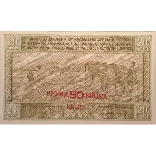 | Obverse lettering | 20 ДИНАРА 20 DINARA МИНИСТАРСТВО ФИНАНСИЈА КРАЉЕВСТВА СРБА ХРВТА И СЛОВЕНАЦА MINISTARSTVO FINANSIJA KRALJEVSTVA SRBA HRVATA I SLOVENACA MINISTRSTVO ZA FINANCE KRALJESTVA SRBOV HRVATOV IN SLOVENCEV БЕОГРAД 1 ФЕБРУАРА 1919 МИНИСТАР ФИНАНСИЈА КРУНА 80 KRUNA KRON M.Cl. Crnčić fec. (Translation: 20 DINARS in all four corners text in darker olive MINISTRY OF FINANCE OF THE KINGDOM SERBIAN CROATS AND SLOVENES (X3) BELGRADE FEBRUARY 1, 1919 MINISTER OF FINANCE red overprint KRUNA 80 KRUNA KRON) |