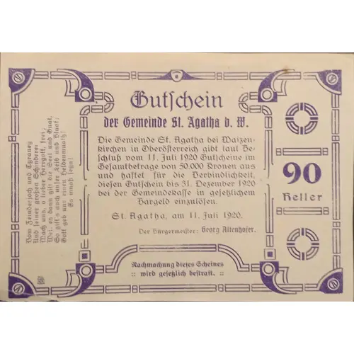 | Opis awersu | 90 Heller, St. Agatha, OÖ., Gemeinde |