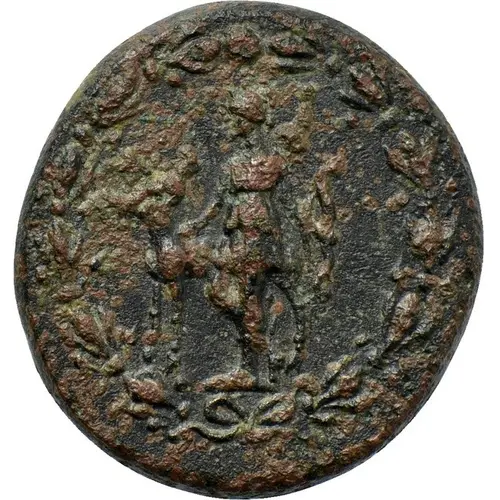 | توضیحات روی سکه | Artemis in short chiton standing left, in front of stag, on which she places her right hand, and holding bow in left; the whole in laurel wreath with berries. |