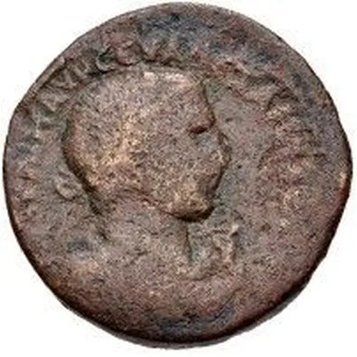 | 表面の説明 | Diademed, draped, and cuirassed bust right; eagle-tipped staff of Asclepius before |