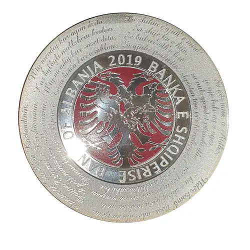 | Ön yüz açıklaması | It shows the Albanian eagle with a outline of the Balkans in it and the outline of Albania which is red and this is surrounded by famous parts from Albanian poems and songs |