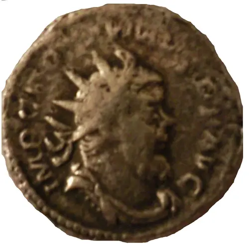 Radiated bust of Posthumus on the right, with cuirass and paludamentum, seen from three-quarters forward. portrait style 3 (or 4) |