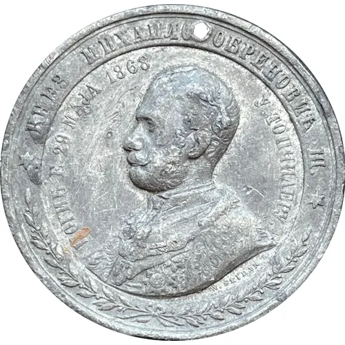 | Надписи аверса | КНЕЗ MИXAИЛO OБPEHOBИЋ III. ПОГИБ E 29 MAJA 1868 Y TOПЧИДЕPY W. SEIDAN |