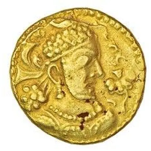 | Описание реверса | Bust of queen wearing horned headdress and diadem, traces of crude Pahlavi inscription to right. |