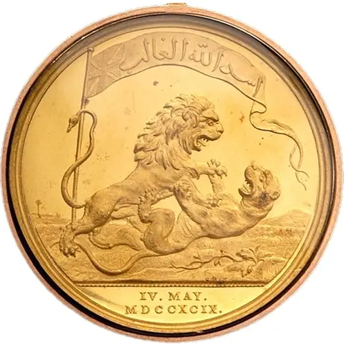 | Obverse lettering | أسـد الله الـغـالـب IV MAY MDCCXCIX. (Translation: The lion of God is the conqueror) |
