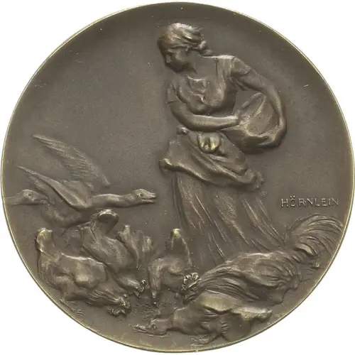 | Opis awersu | Standing woman feeding geese and chicken. |