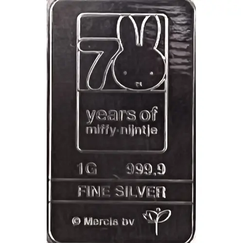 | Descrição do anverso | A unique issue for miffy`s 70th birthday! Especially for the birthday anniversary of the worlds favorite bunny, the Royal Dutch Mint is launching a 1 gram Silver bar. It is without a doubt the most unique Silver bar you have ever seen: a real must-have! |