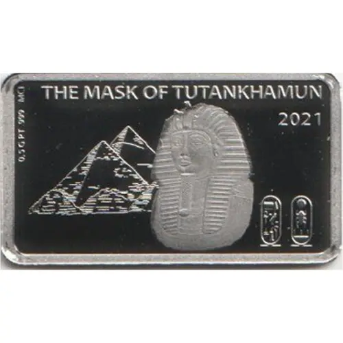 | Obverse lettering | THE MASK OF TUTANKHAMUN 2021 0.5G PT 999 MCI (Translation: The mask of Tutankhamun 2021 Cartouche left: Name `Tutankhamun, Ruler of Upper Heliopolis.` Right: Throne name `Nebcheperure.`) |