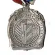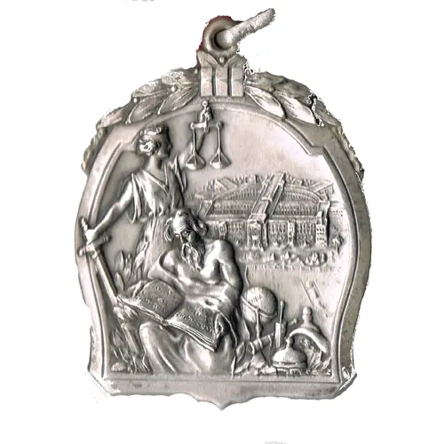 Female figure looking to the right, representing justice. She holds a sword in one hand and a pair of scales in the other. At her feet are a globe, a still and a telescope. In the background is an image of the College. No text. |