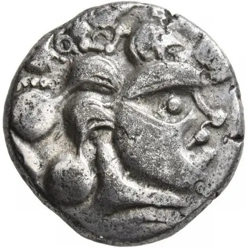 | 裏面の説明 | Human-headed horse galloping right, stylized charioteer above, holding whip; in field to right, x within square; beneath horse, boar to right. |