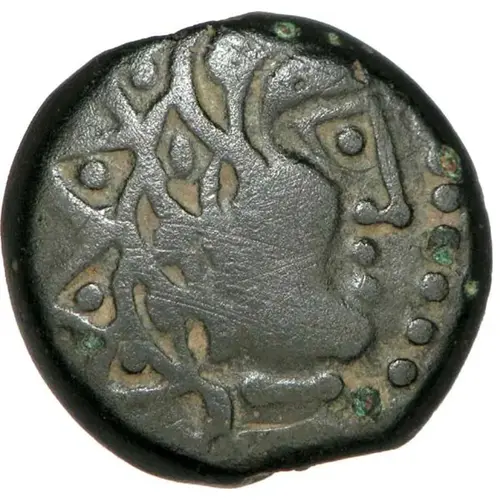 | Descrizione del dritto | Head to the right, the hair schematized in four wavy locks framing the face and with globulated triangular ends; around, ruffled. |