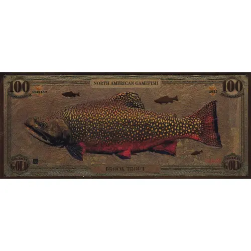 | نوشتههای روی توکن | NORTH AMERICAN GAMEFISH 100 MILLIGRAMS SERIES 2 2025 24 KARAT GOLD U.S. PATENT 10781520 BROOK TROUT AURUM INTERNATIONAL PATENTS PENDING MADE IN THE USA |
