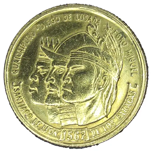 Conjoined heads of Guaicaipuro, Diego de Losada and Negro Miguel, names around, Original city name and year of commemorated event below, in a ribbon. |