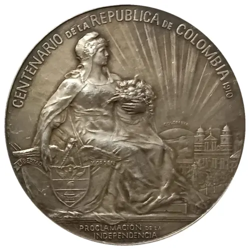 | Opschrift keerzijde | PRIMER CENTENARIO DE LA PROCLAMACION DE LA INDEPENDENCIA DE LA REPUBLICA DE COLOMBIA 1810 - 1910 F. OLAIS (Translation: First centenary of the proclamation of Independence of the Republic of Colombia 1810 - 1910 F. Olais) |