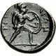 | توضیحات پشت سکه | Warrior striding right, wearing Corinthian helmet and holding short sword in his right hand and round shield with his left. Within shield, hippocamp (?) to right |