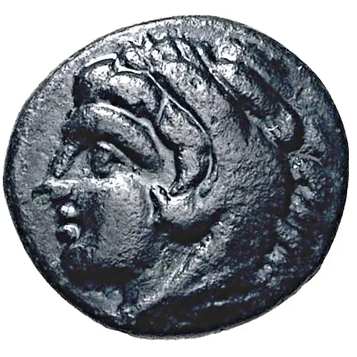 | Mô tả mặt trước | Head of Herakles facing left, wearing lion skin |