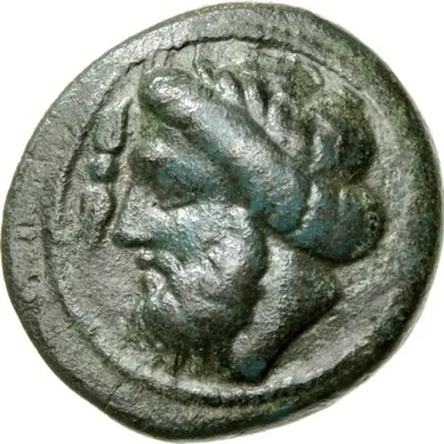 | Описание аверса | Fine style head of Zeus facing left, laureate and bearded and in front of him a thunderbolt; all in a circle of dots. |