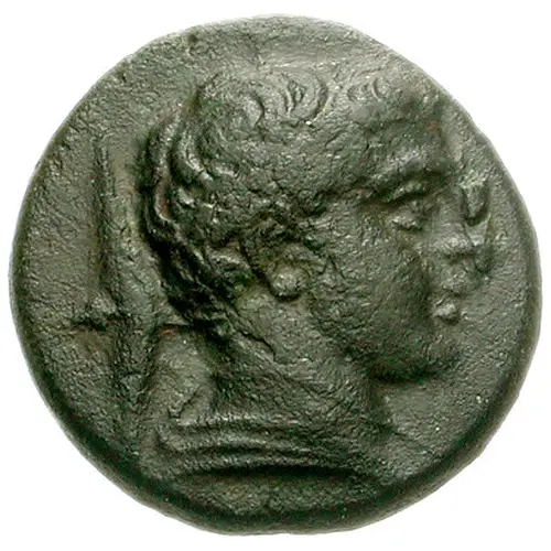 | Descrição do anverso | Bust of young Hermes facing right, cloak tied at neck and a petasos slung behind neck |