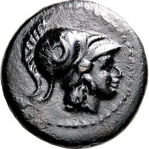 | Popis líce | Head of Athena wearing Corinthian helmet to right, with serpent coiled on bowl of helmet |