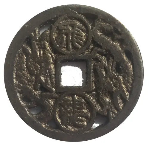 | Reverse description | Two dragons at 3 o`clock and 9 o`clock positions with two Chinese charaters at 12 o`clock and 6 o`clock, square hole in center. |