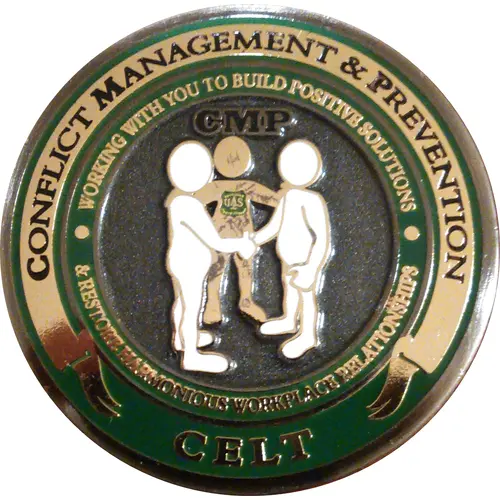 | Надписи аверса | CONFLICT MANAGEMENT & PREVENTION WORKING WITH YOU TO BUILD POSITIVE SOLUTIONS · & RESTORE HARMONIOUS WORKPLACE RELATIONSHIPS · CMP CELT (Translation: CMP CONFLICT MANAGEMENT AND PREVENTION CELT COMBINED EASTERN LEADERSHIP TEAM) |