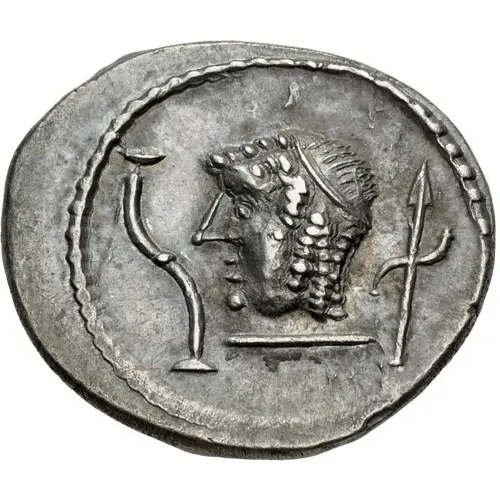 | توضیحات پشت سکه | Facing boukranion; curved symbol of Almaqah to left, monogram to right. |
