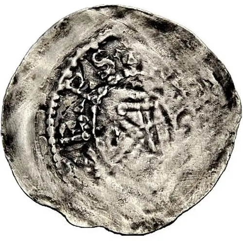 | Opis awersu | Kreuz mit Punkten in den Winkeln (undeutlich), (ODELRICVS) EPS (P mit Kürzungsstrich). Rv. Kirche, r. im Feld Y, +BASI (EA CIVTA)S |