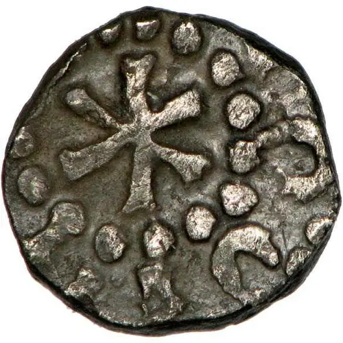 | Descripción del anverso | Cross with 6 arms withint a beaded circle; legende around (undecipherable). |