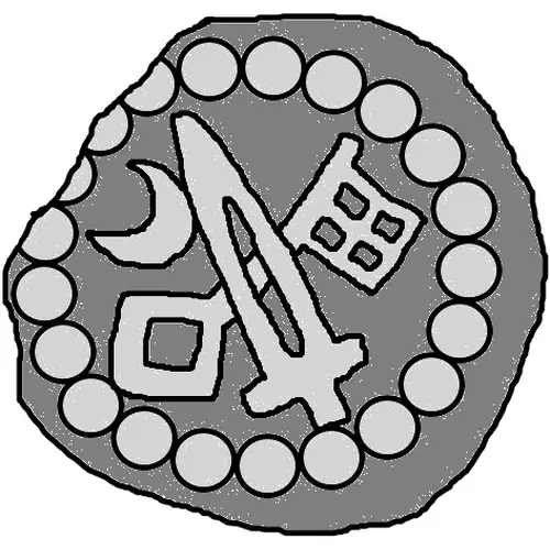 | 表面の説明 | Crossed sword and key with moon to the left, all surrounded by a ring of dots. |
